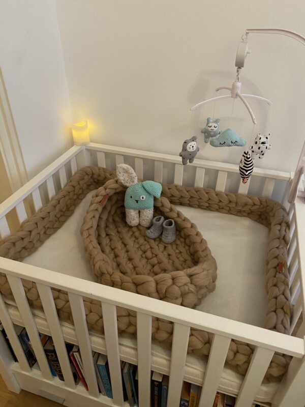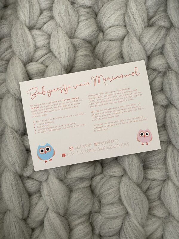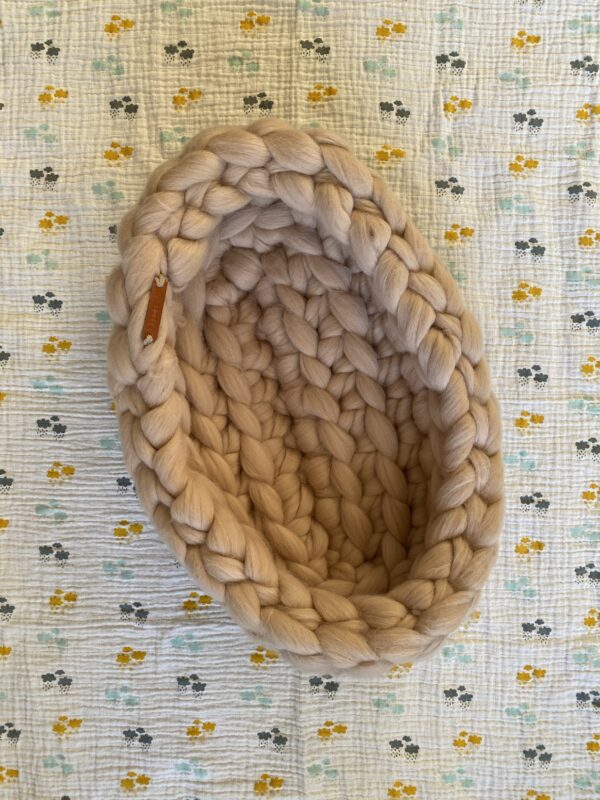 Het is een “nestje” wat je kunt neerleggen in de box, wieg of kinderwagen. Ze zijn gemaakt van 100% puur zuiver merino lontwol. Elk babynestje is uniek omdat het met de hand wordt gemaakt. Het is een stijlvolle aanvulling voor iedere babykamer, in de woonkamer of in de box.
