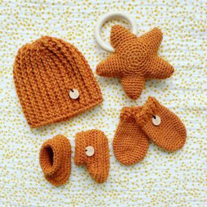 Babysetje met een muts/beanie, wantjes en slofjes.