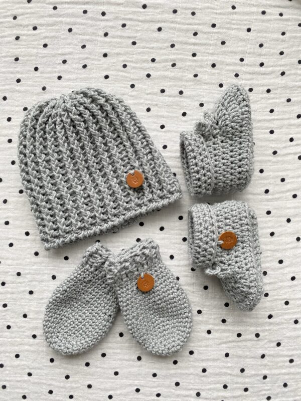 Babysetje met een muts/beanie, wantjes en slofjes.