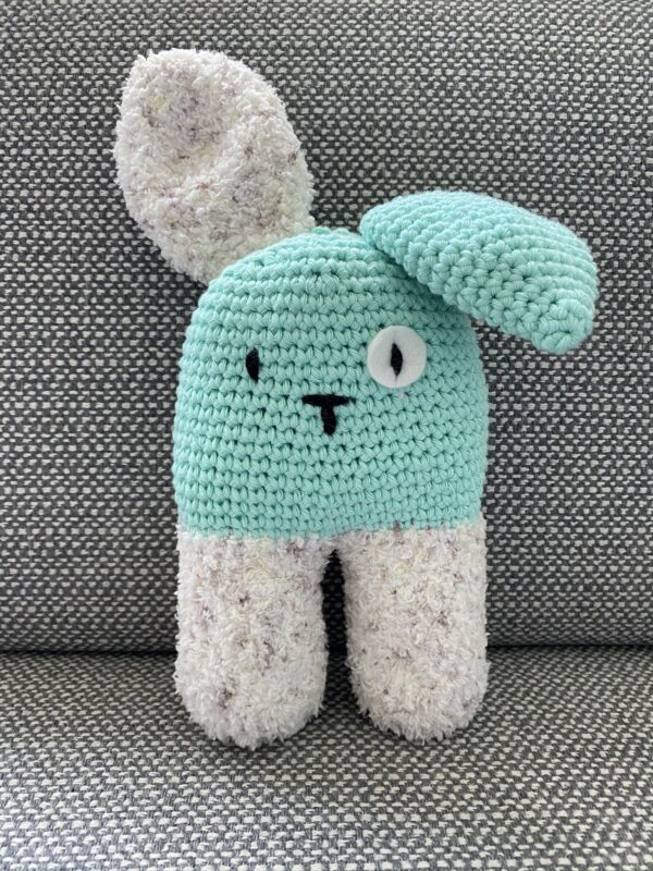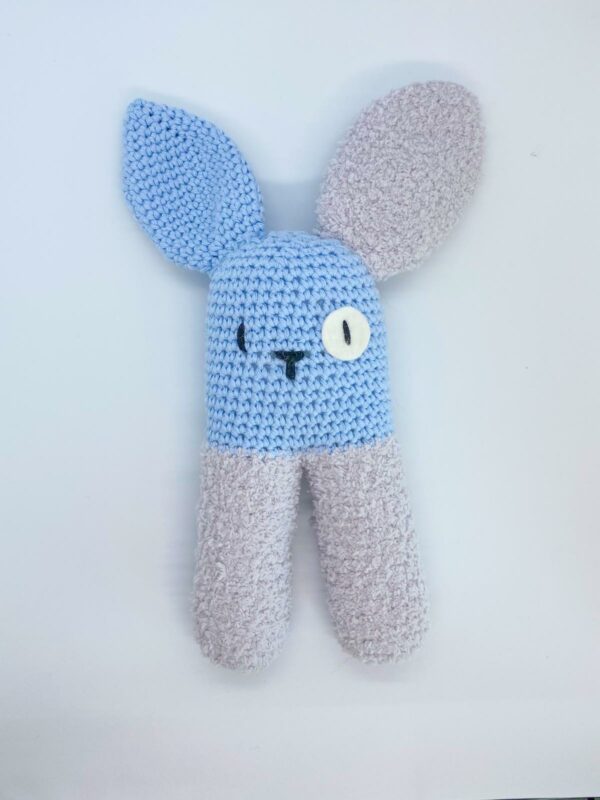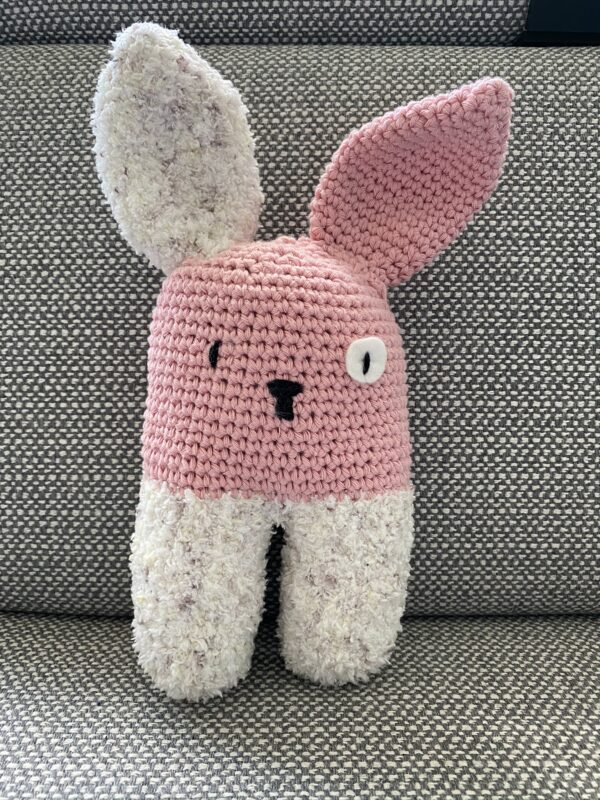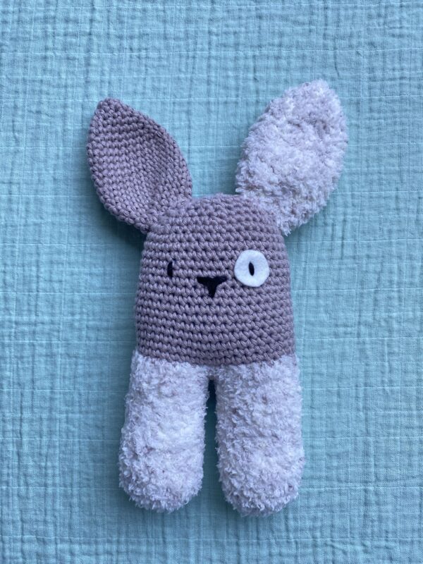 Handgemaakte knuffel/rammelaar “Konijn”. Het konijn is gemaakt van Scheepjes Sweetheart soft (100% polyester) en Cahlista (100% katoen).